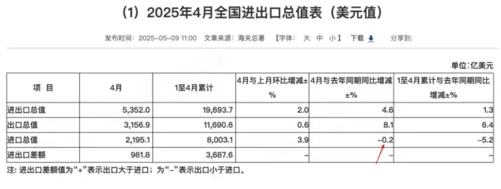 海关总署今日公布的数据显示,4月份,按美元计,中国进口同比下降0.2%,较3月4.3%的跌幅收窄。