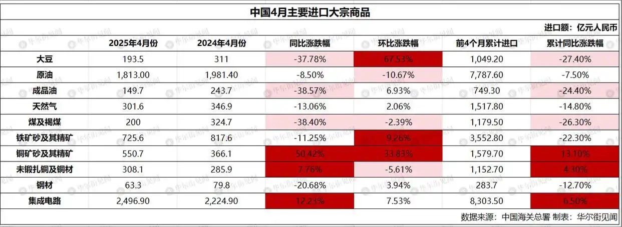 环比方面,4月大豆进口环比增长72.59%,达到608.1万吨,铜矿砂及其精矿4月进口环比增长22.14%,至292.4万吨,成品油环比增加16.84%。